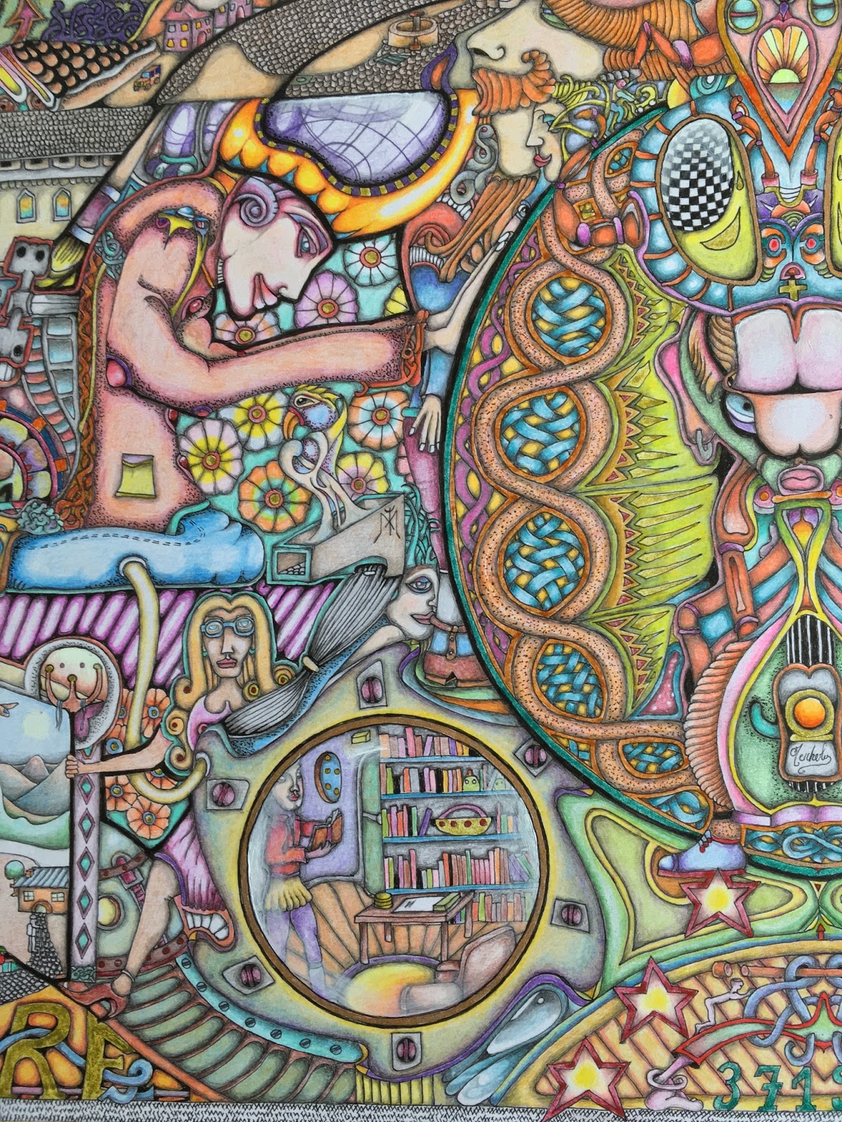 Travail réalisé sur papier fin avec de l’encre noire, du crayon mine noire et couleurs, du crayon pastel, du stylo bille, de l’acrylique et de la gomme arabique.