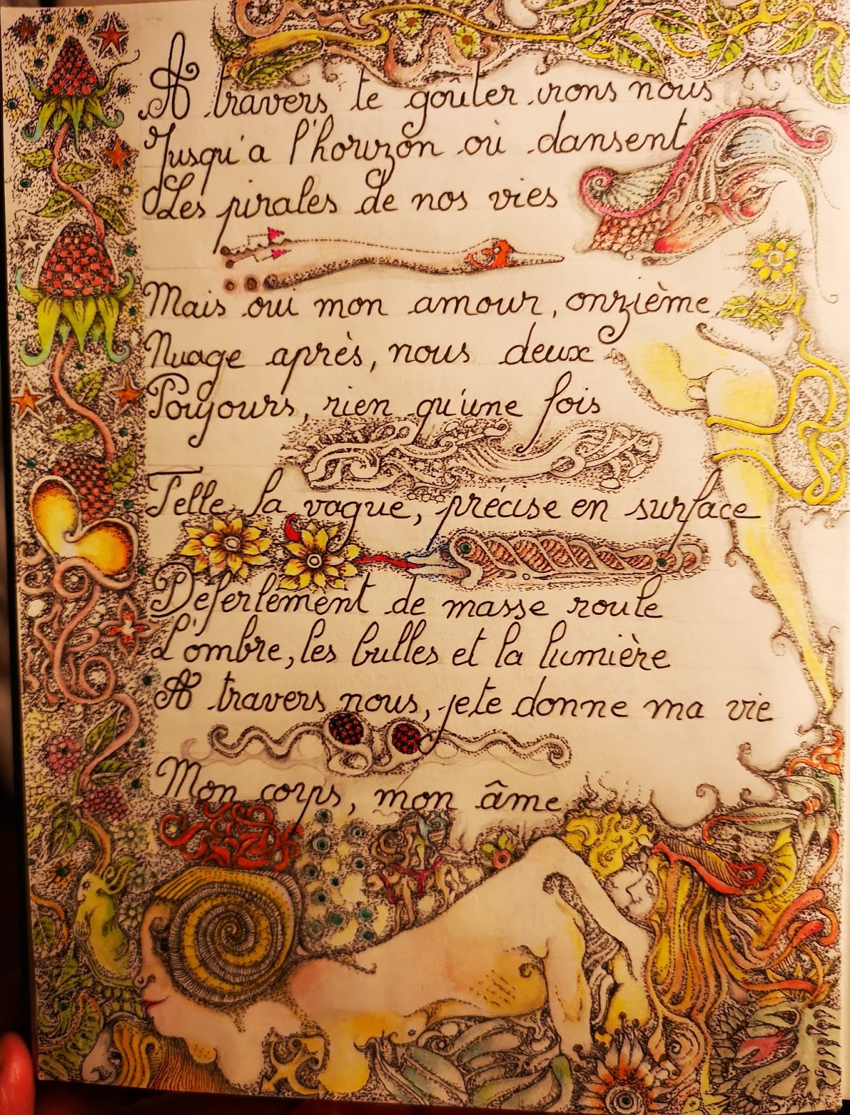 Dans ce dessin, le trait posé à la mine graphite, architecture du monde. L’encre de Chine révèle la profondeur, tandis que l’aquarelle surgit par touches — comme des éclats de vie, des présences. Un oiseau, une chouette, un être à tête de lapin…